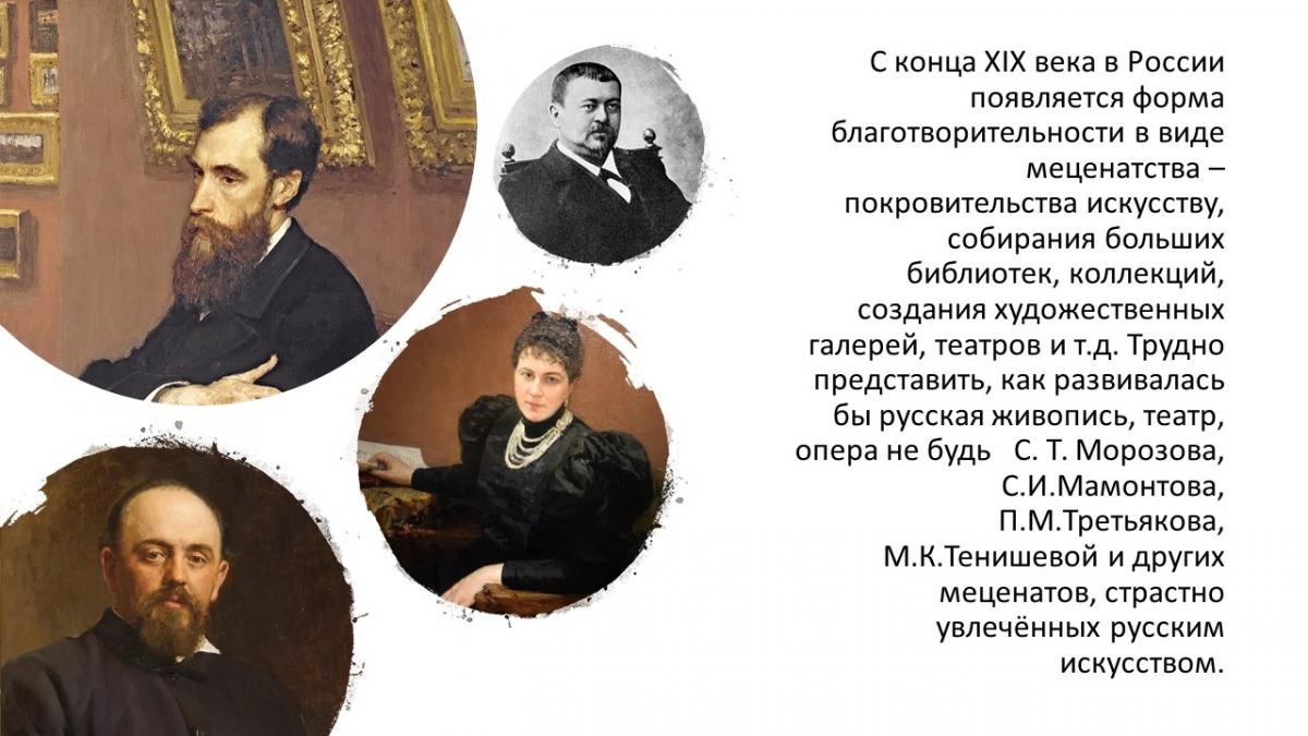 Традиции меценатства и благотворительности имеют глубокие исторические корни. Меценатство — это состояние души. Современный меценат — это не тот, кто даёт деньги, средства с сухим холодным расчётом. Это люди, которые обладают огромной душевной любовью к своему народу, Отечеству. Они соучаствуют в жизни России, как делали великие предки - Третьяковы, Боткины, Найдёновы, Прохоровы, Мамонтовы, Щукины, Строгоновы, Шереметьевы, Морозовы, Тенишевы и многие - многие другие.